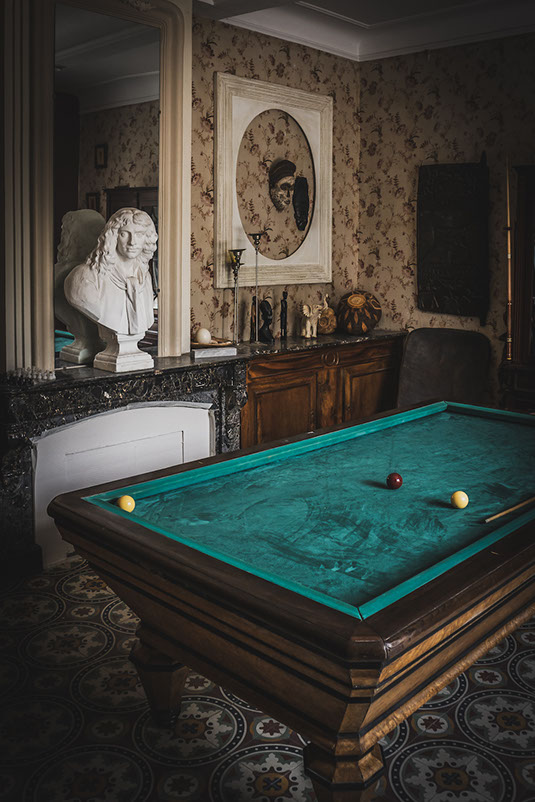 Un cabinet de curiosités avec sa bibliothèque accueillant un billard français de l’époque NAPOLEON III. Un piano viendra compléter cet ensemble hors du temps.