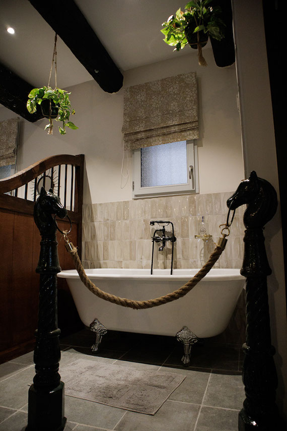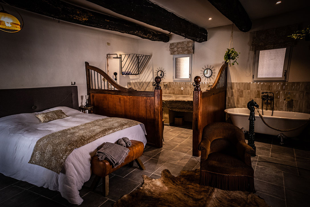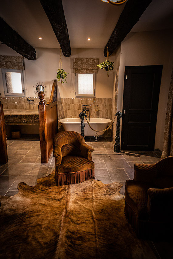 Située dans une des 2 anciennes écuries, vous y trouverez le charme de l’ancien et cet esprit hippique : poutres bois, murs enduits, robinetterie originale, vasques dans les anciennes mangeoires. Une expérience unique ! Sans oublier, un petit extérieur sous l’auvent devant la chambre afin de bouquiner et se relaxer au calme.